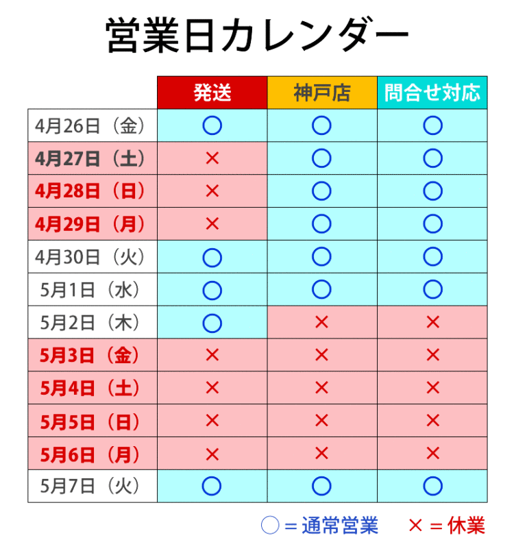 ■GW休業のお知らせ(2024-04-21発表) ゴールデンウィーク期間は下記日程を休業期間として、商品発送ならびに店舗営業など、すべての業務をお休みさせていただきます。お客様におかれましては大変ご不便をおかけいたします…