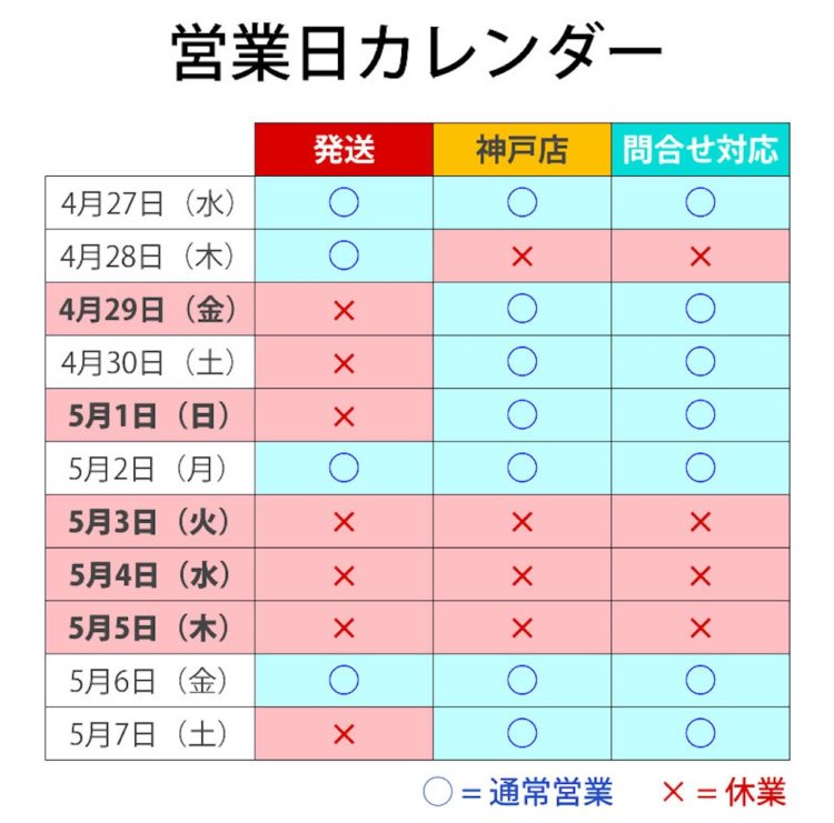 ■GW休業のお知らせ(2022.04.26 発表) ゴールデンウィーク期間は下記日程を休業期間として、発送業務ならびに店舗営業などをお休みさせていただきます。 お客様におかれましては大変ご不便をおかけいたしますが、何卒よ…