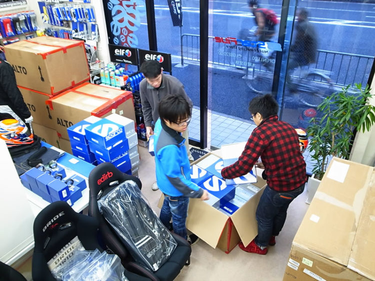 2014年の営業最終日。年末の大仕事と言えば大掃除ですが、今年の神戸店はもう一つ大きな仕事が待っていました。滑り込みセーフで入荷した大量のSparco製品。大掃除を手伝いに来てくれていたヘルパー君にも手伝ってもらい、早速…