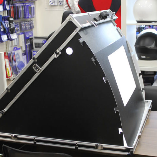 Sparcoの新製品が入荷して来たので閉店後の神戸店で即席撮影会を開催しました! モデルに任命すると何故かレーシングスーツの着用を頑なに拒むスタッフS君を黙らせて、準備完了。 ヘルメットを被った途端、…