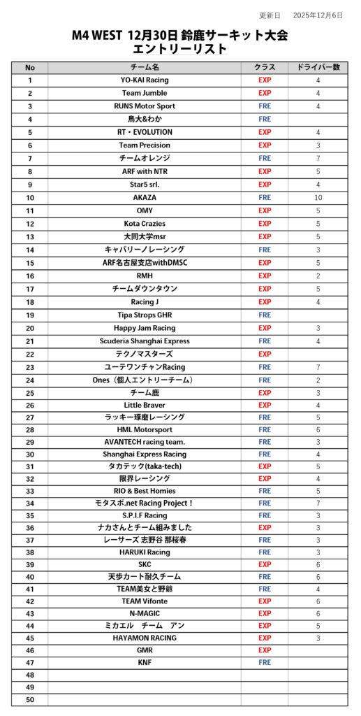 - チームエントリーはドライバー2名から10名まで登録可能です