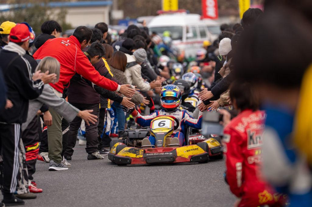 M4カートレースの定番行事とも言える、チェッカー後の「花道」では、チェッカードライバーが沢山のチーム関係者とハイタッチをしながらピットロードをゆっくりと駆け抜けます。